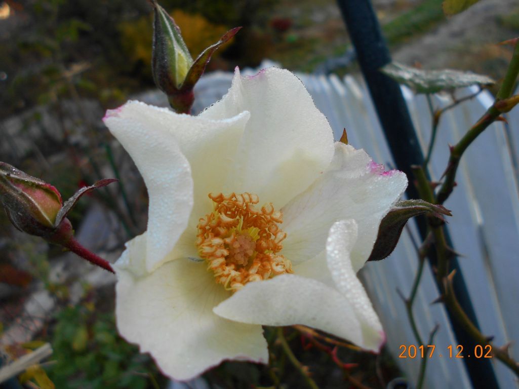 スペリシュホープもなんだか寒そうに少しピンクも入った白い一重の薔薇