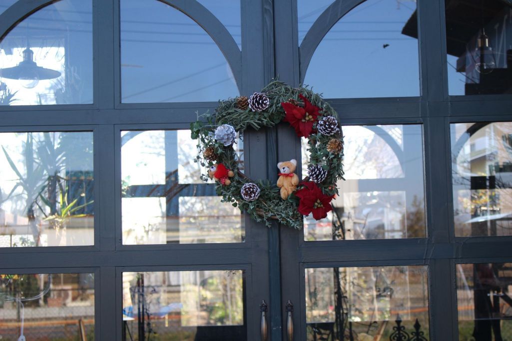 くまさん乗っかって可愛い!リースの向こうはお部屋暖かそうでいいですね。