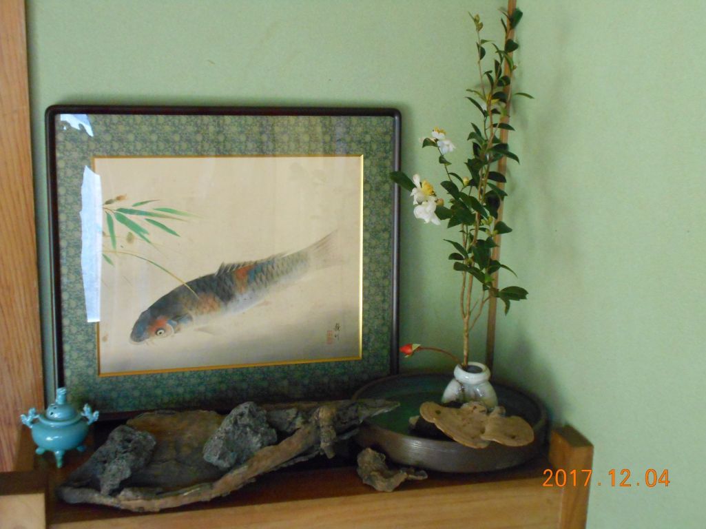 今日は集落の天神山催事玄関の出迎えに白山茶花と厳島薔薇