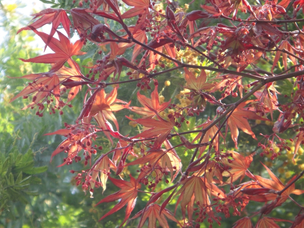 赤い葉を出したモミジの下に立ちますと、たくさんの赤いツボミがありました。