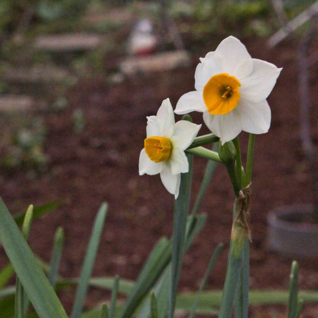 開花が早いですね。どうして?異常気象のせいでしょうね。隣の畑に水仙は差し上げました。隣もわが家からの眺めにはとってもいいのです。日本水仙はいい香り、我が家のはまだ、地面の中です。