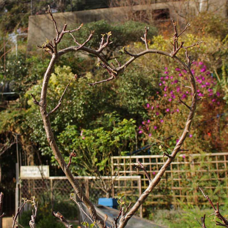 私はバラの誘引、剪定作業を見にジョイフルのボタニックガーデンを見に行きました。葉が落とされたバラの木は誘引がしっかりしてあり勉強になりました。