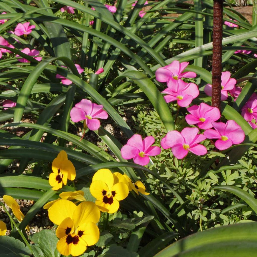 晴れてくると一斉にピンク色のオキザリスの花が開いて、花壇は華やぎます。