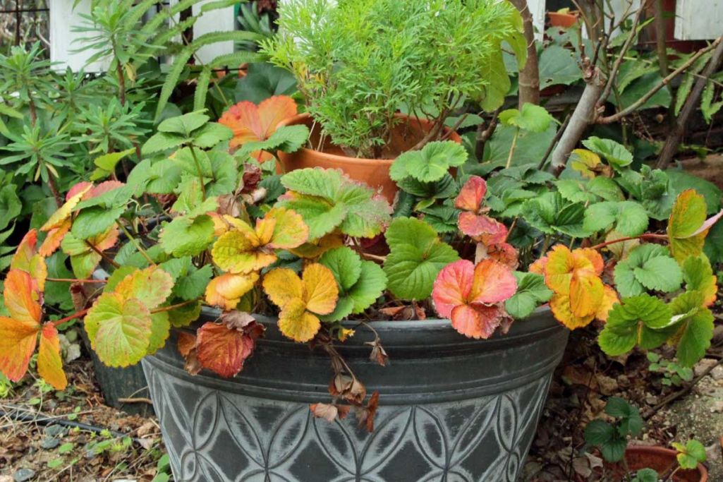 寒い日が続いていろんな植物が冬の色に変わってきています。初夏にはマーガレットの花を囲んでたくさんイチゴが実りました・・