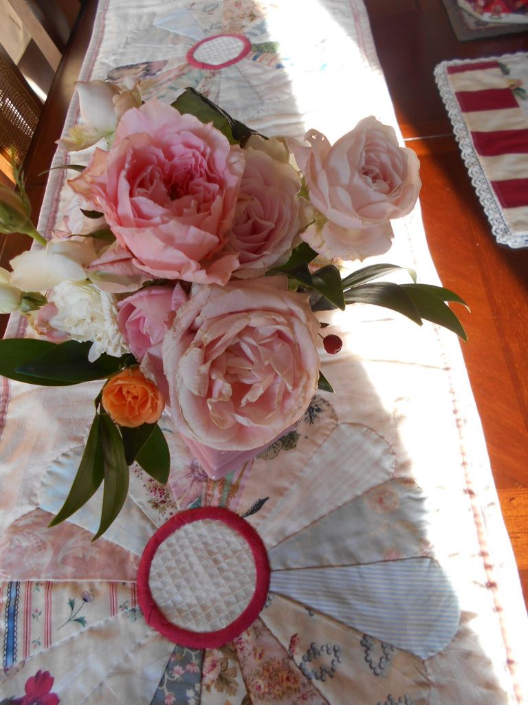 テーブルセンターもお花もピンクで、 パッチワークは古布のシルクを利用
