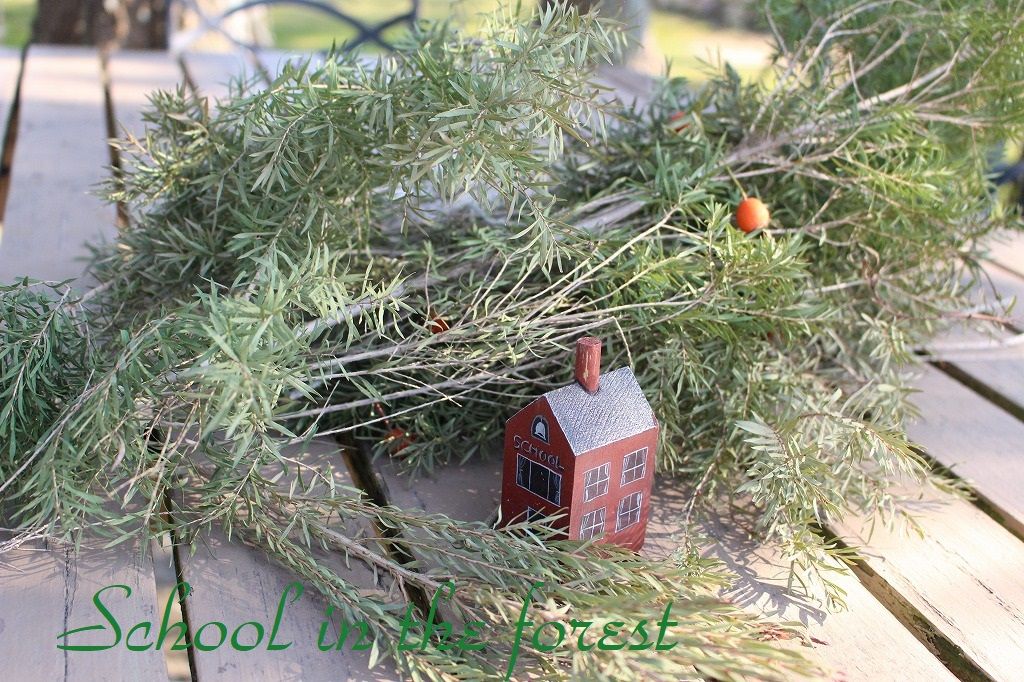 切り取った枝に小さな学校を置いてみました。
