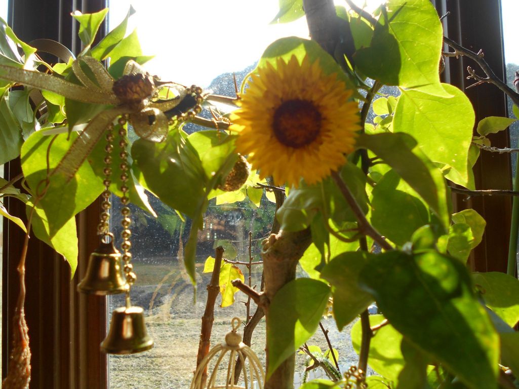 ドライフラワーになったコロロを一輪、ブーゲンビリアの側に飾ってます。