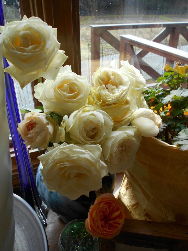 玄関に飾っていた薔薇、今日は出窓のゼラニュウムと一緒に飾ります。