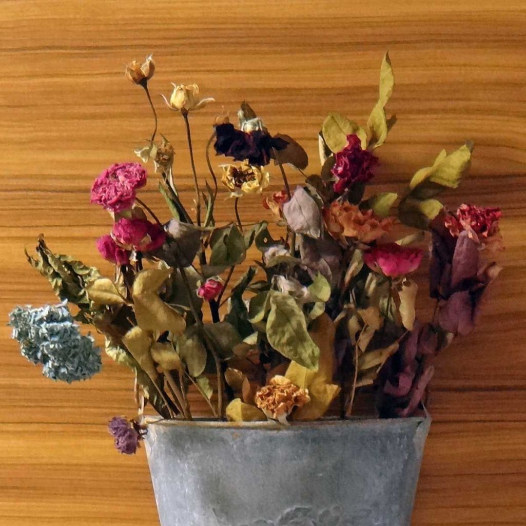 職場で一輪挿しで楽しんだバラなどのお花のうち散らずに萎れてきた花はドライにして執務室の壁掛けのアンティークの器に挿してきました。バラの他、アジサイやダリアもあります。
