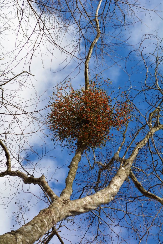 室内デコレーションではない自然のヤドリギ、青空を見上げながらこうやって眺めるのはとても素敵ですね~♡ でも、今日はこの下に立ったら(*´ε`*)チュッチュですね笑