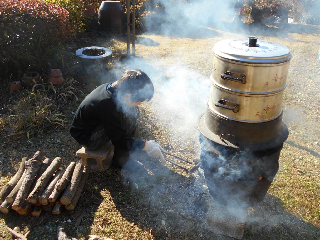 薪の火でもち米を蒸すんですね!すごく憧れます~♡ ひょっとして、そのあと杵と臼でぺったんぺったんしたのかな?私が子供のころには地元の神社で大人たちがやってたけれど、今はもう見ることができません。神の庭でお餅つき、素敵な暮らしですね~♡ お孫さんも、そんな家に生まれて幸せだなぁ~。