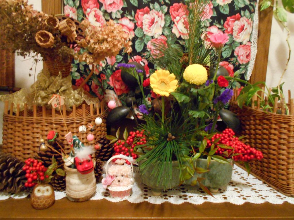松は減反から松ぼっくの付いたもの、日の出をイメージの丸い黄色の菊、昔懐かしいのです。両親が鉢に育てたのを見たことがあります。