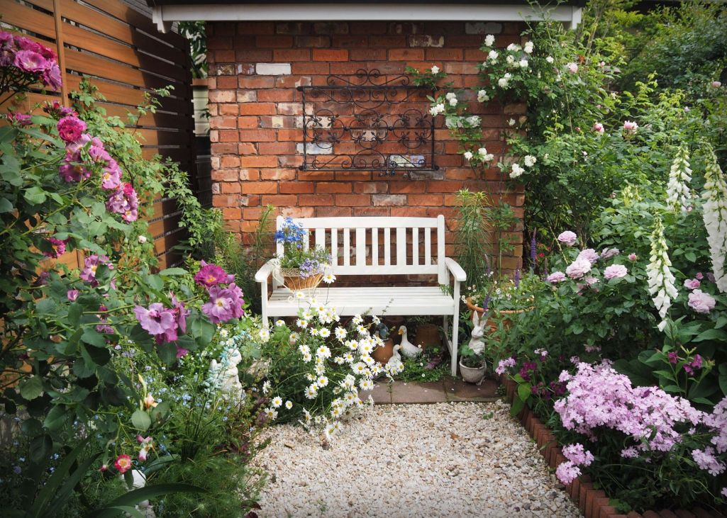 そのベンチに腰掛け、ゆっくりと眺めていたい場所なんでしょうか。後ろのレンガやアイアン飾りフックもさりげなく素敵!