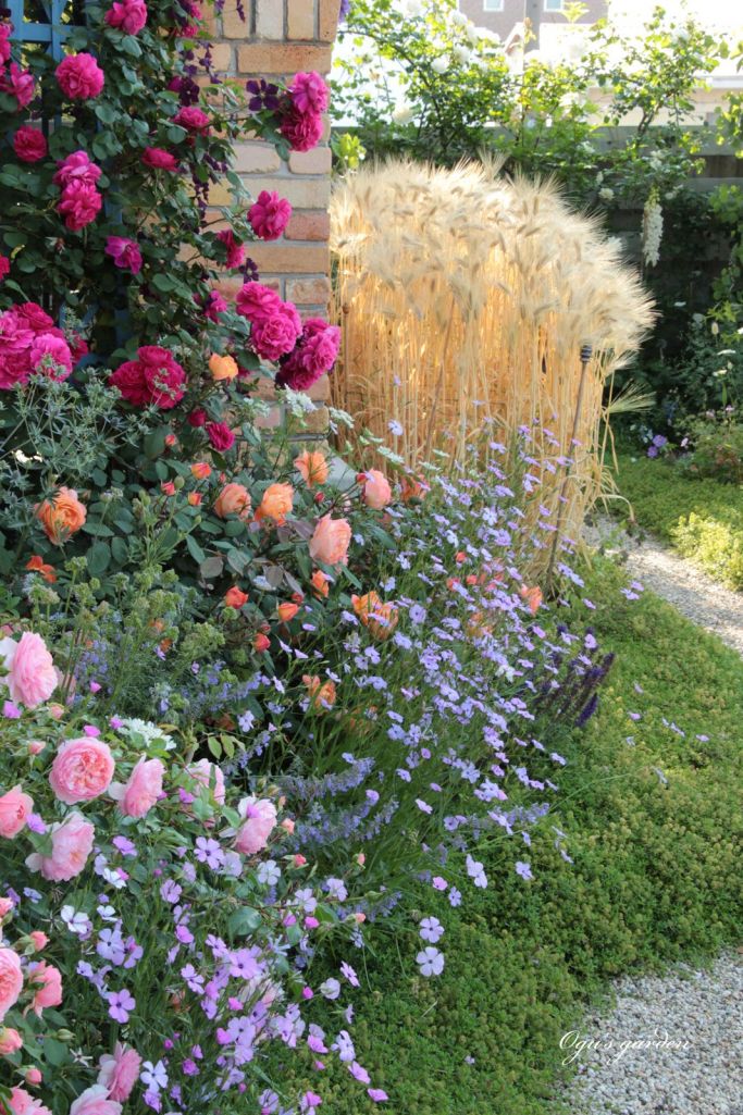 ゴールドに輝く麦のユニークなお庭と繊細な花々の組み合わせ