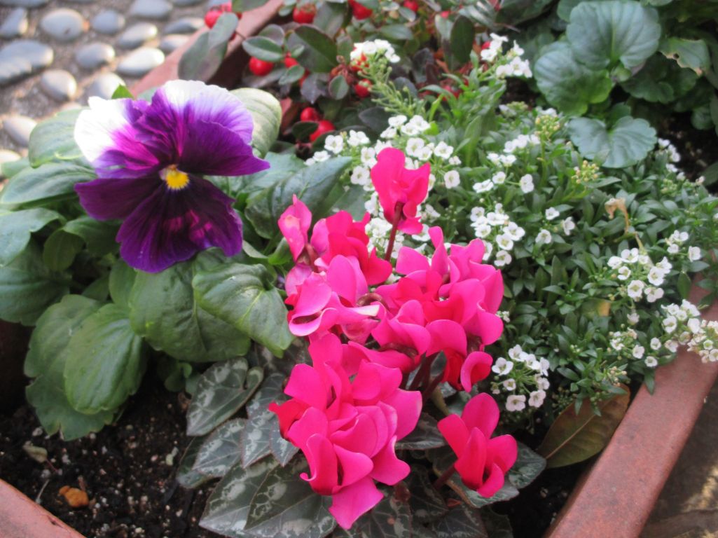 寄せ植え,ガーデンシクラメン,パンジー,チェッカーベリー,