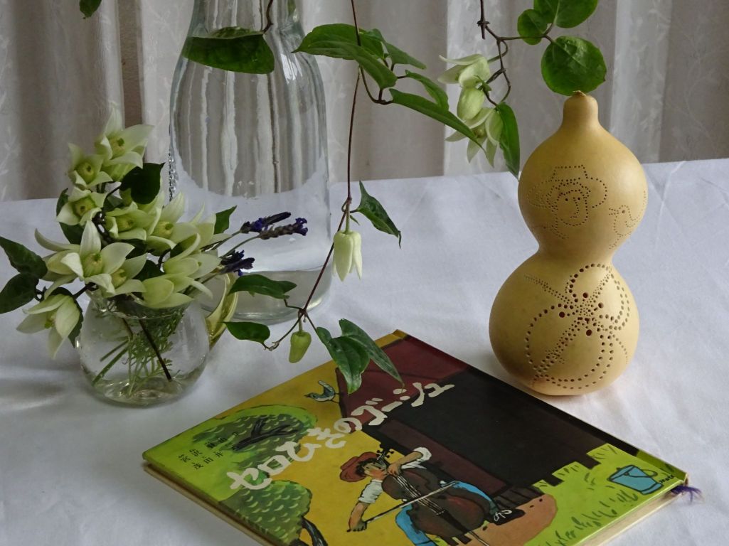 「セロひきのゴーシュ」・・昨年種から育てた百成瓢箪でランプを。 冬咲きクレマチス・ユンナンエンシスと。