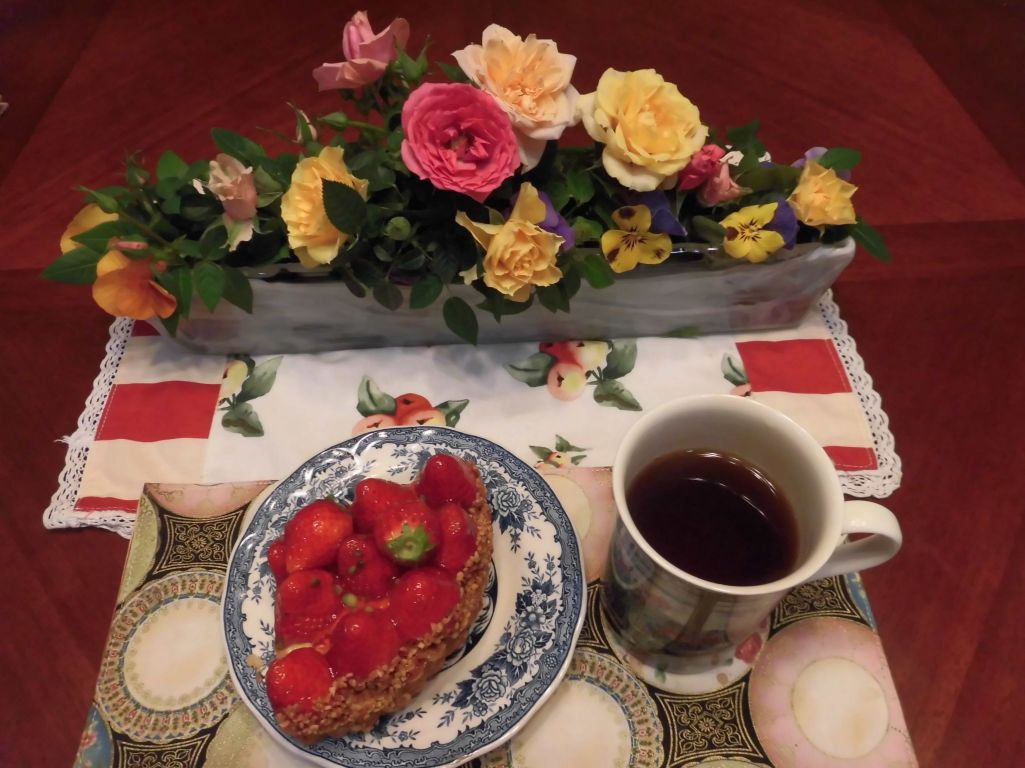 お部屋の中はポカポカ、ミニ薔薇の苗とビオラの苗を購入したので、カットして、お部屋でアレジメント!苺タルトで春待ち