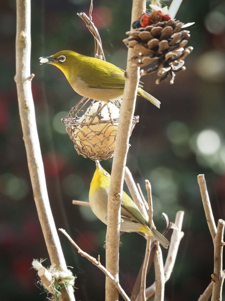 たぶん年末にカップリングしたばかりのメジロ夫婦。イマイチ仲悪くてエサを取り合います^^; この時はめずらしく、手作りバードケーキを一緒に食べてました。