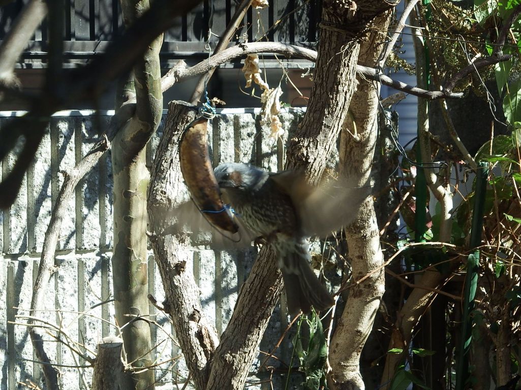 メジロのためにバナナを置いても直ぐにヒヨドリが見つけてメジロを追い払って