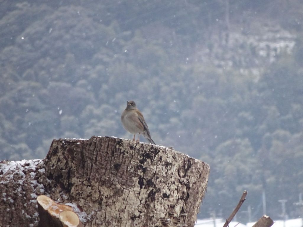小雪舞う朝・・シロハラ君、大きな切り株の上で偵察中?