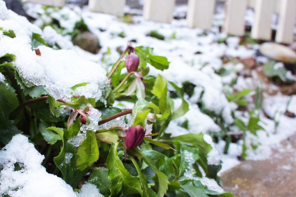 白いフェンスの前の花壇で毎年咲いているピンクのヘレボルス、ちょっと寒そうです・・