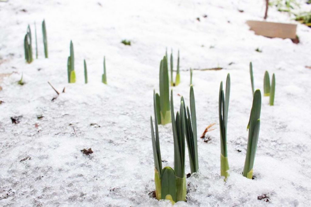 ブルーベルのそばで、ブルーベルよりちょっと早く花を咲かせるラッパ水仙たちは、一足先に葉っぱを長く伸ばしてきています・・