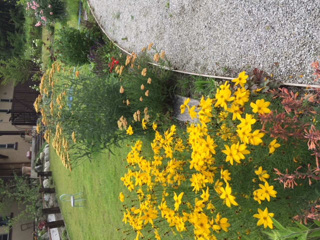 フロントガーデンのイエローゾーンのボーダーガーデンです。 黄色の花は夏の暑さにも負けない元気な花が多く、もりもり育っています。