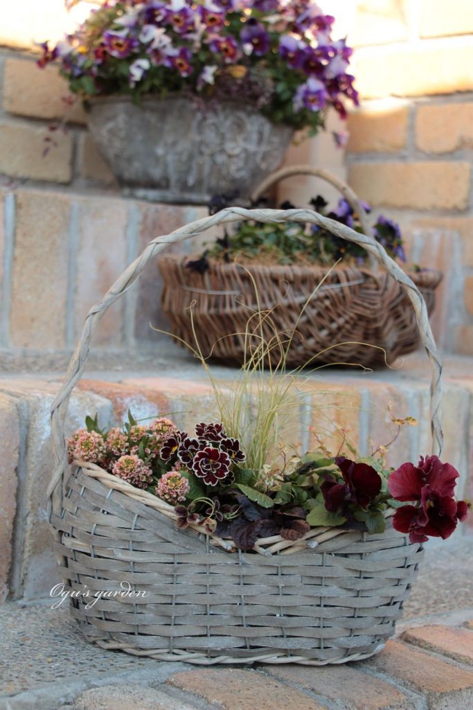 手前のバスケットは2018年初めて寄せ植え第一号です。いろいろ選んでの詰め合わせです。寒いのでこのパンジーの花付きはいまいち(*_*;3月頃に咲くのかな?
