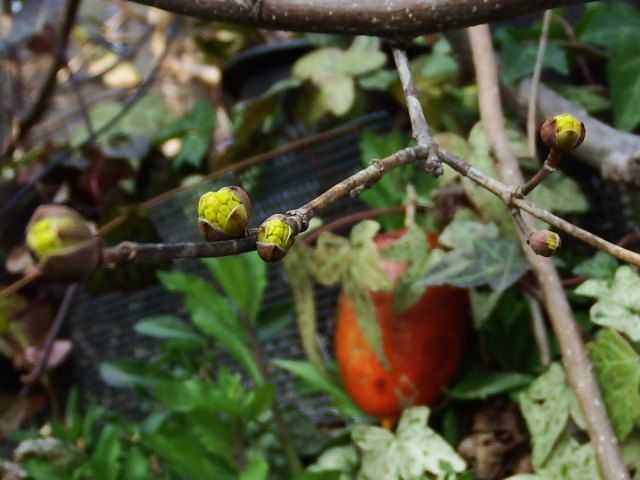 2月下旬、例年になく寒かった今年の冬ですがもう少ししたらサンシュユの花が見られます、蕾も膨らんできました、後ろにはまだ朱いカラスウリがひっそりと、、、