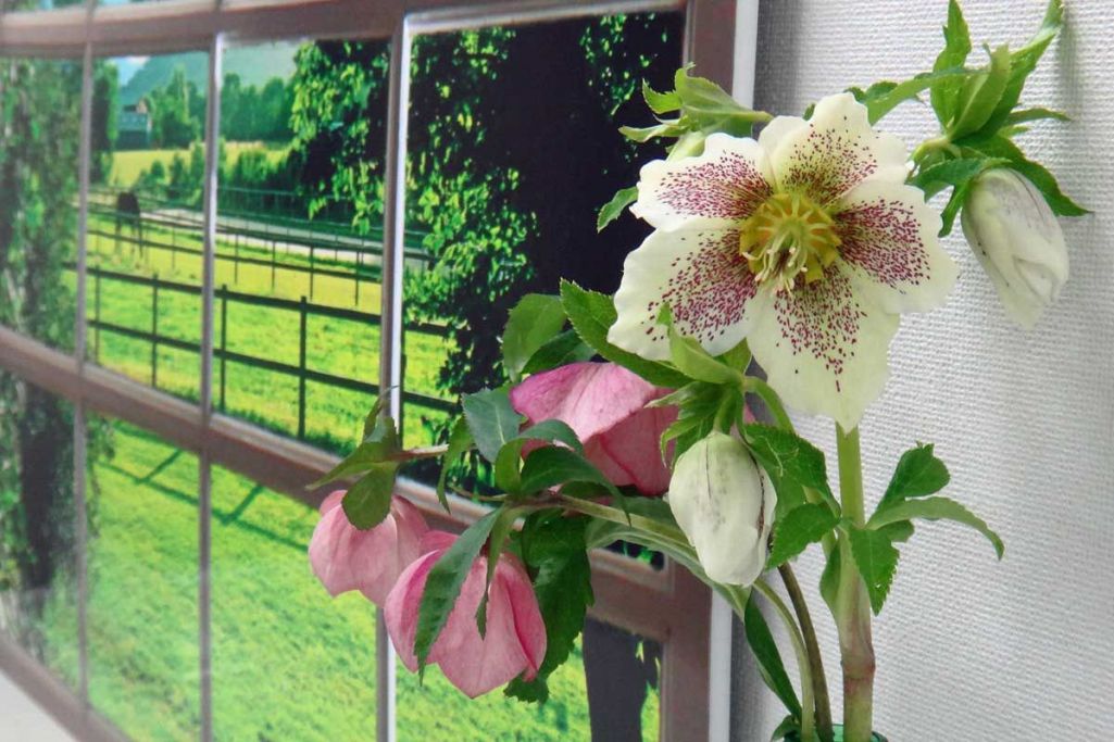 バラのない今、クリスマスローズをニセの窓に飾ります・・