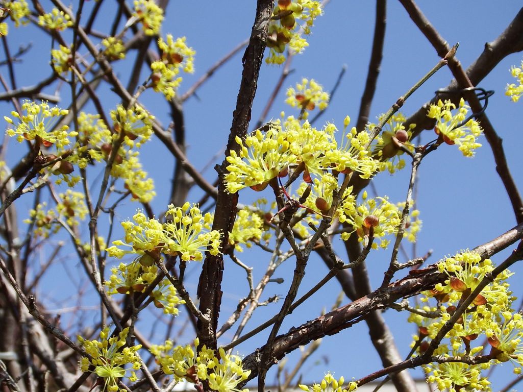 3月の青空にサンシュユの花が爽やか