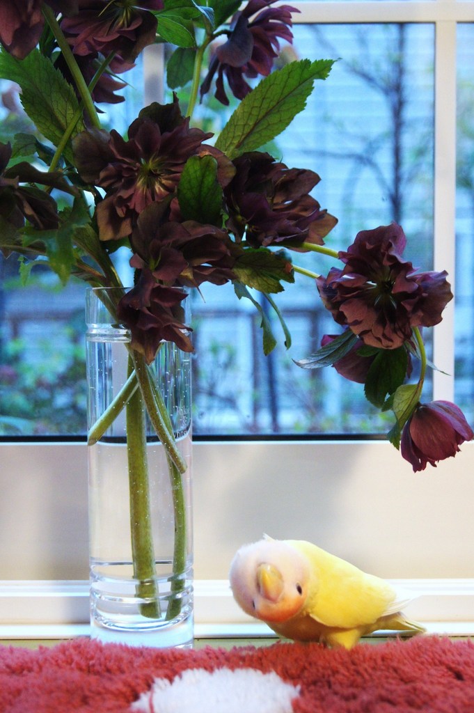 すごーい、かわいい♡さくらちゃん!下からお花をみてるのかな?首が180度回ってますね。うちのセキセイインコはそんな凄技できませんよ~。