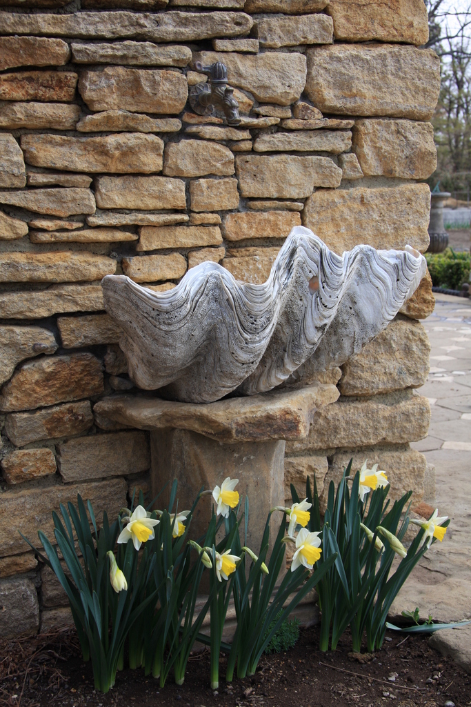 素敵ですね。シャコ貝のシンク。亀のベルちゃんの後ろに写っていたのは、シャコ貝だそうです。足元のスイセンがとってもよく合って、いい感じ!