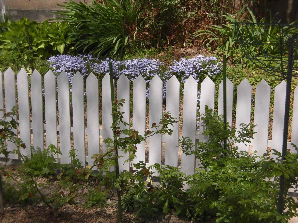 遊べる庭からは土手に芝桜とジャーマンアイリス、ネリネ・・・モッコウバラにも蕾がたわわに付いてます。手前は何種類かの薔薇達