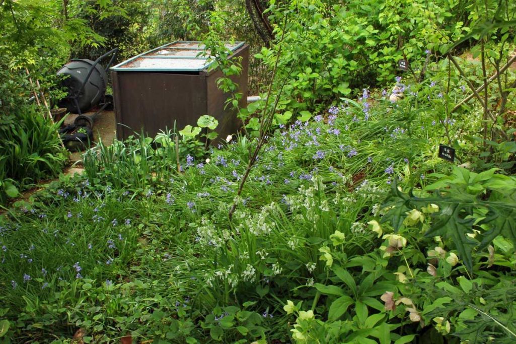ブルーベルの庭にいよいよイングリッシュブルーベルが咲いてきました。その手前ではミツカドネギが満開、そしてクリスマスローズもまだ少し花が残っています・・