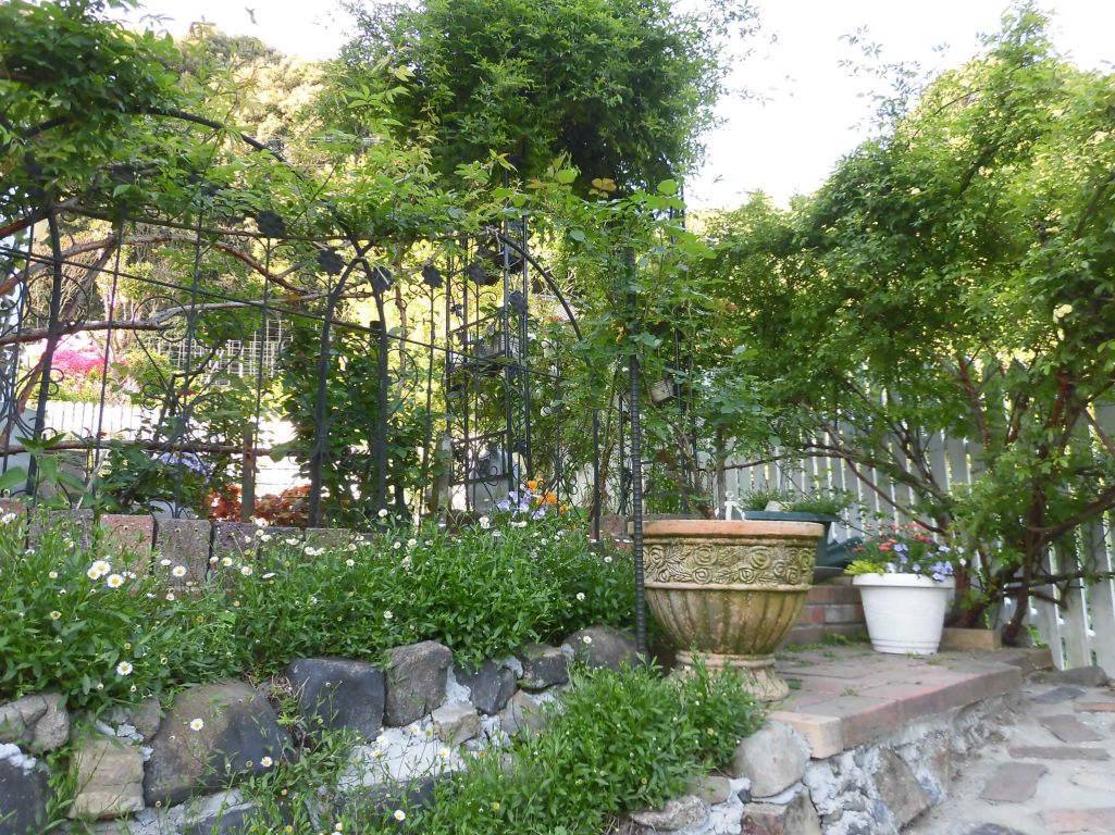 堺の庭から下へ食を愛でる庭へと続く階段土手にエリゲロンがたわわに咲き始めました。