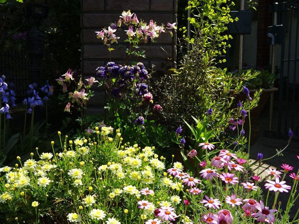 早朝の玄関先の花たち・・オダマキピンクランタン、ウインキイ等が開花しました。 大きなコンテナに4,5年植えっぱなしです。