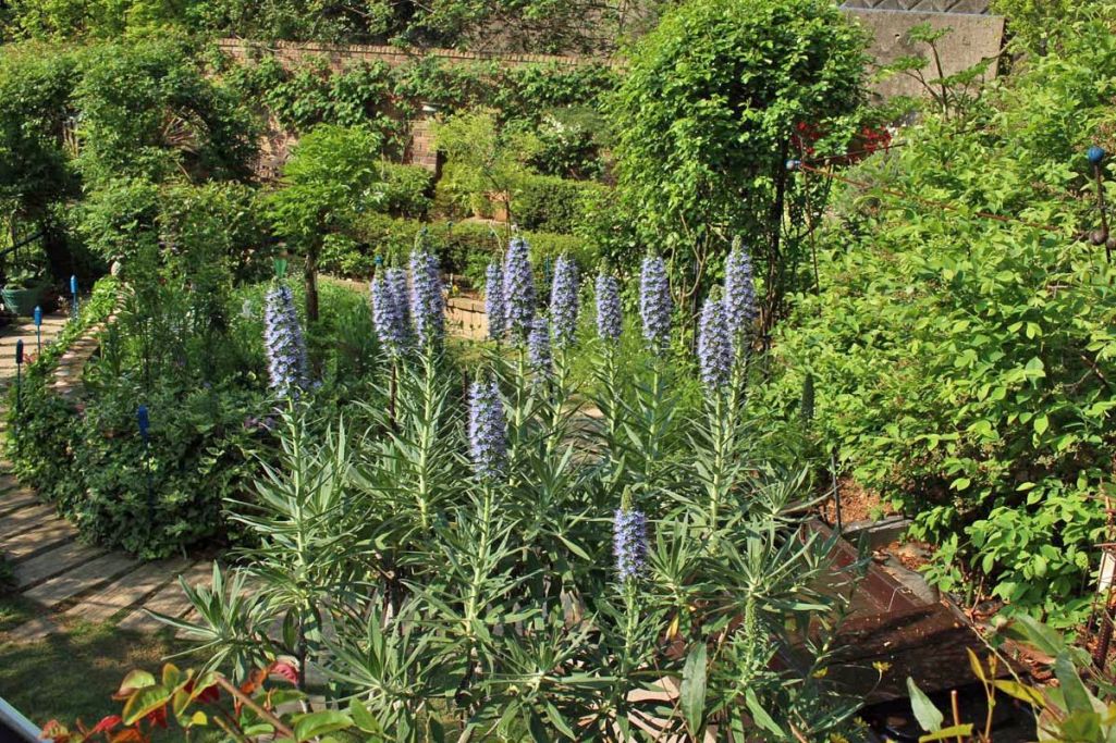 フェンスの裏からエキウム越しにみる、バラの開花を控えて緑が美しいメインガーデン・・