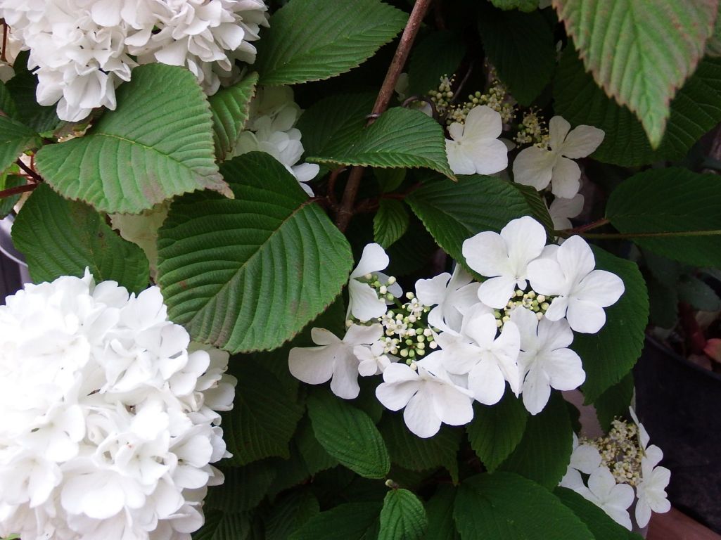 ガクアジサイのように咲いているヤブデマリの花です、今は純白ですがやがてピンク色に染まって行きます 左の丸い花はオオデマリです