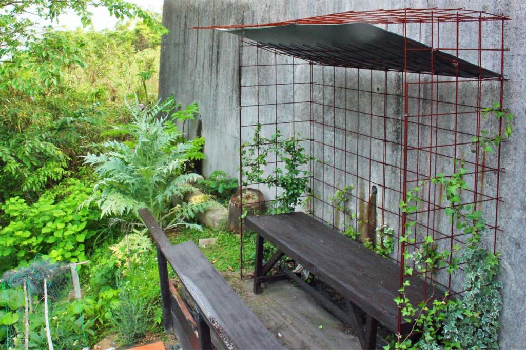 ブルーベルの庭の一番上、富士見台と名づけた屋根つきベンチ、アーバーシートの奥に地植えにしています。半日しか日は当たりませんが、それなりに大きくなっています。ここから糸島富士が正面に望めます。金網に誘引しているアイビーが今年はかなり覆ってくれそうです。