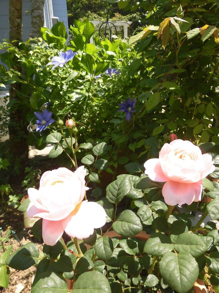 クレマチスは昨年より色味が紫が強いのは(?_?)友人より頂いたもので名前がわかりません。もう少し薄かったはず、バフビューティーと似合いそうでこの場所