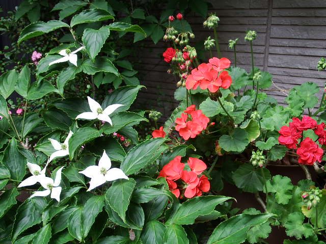 鉢植えのゼラニウムとヤマボウシの花、赤と白のコラボです