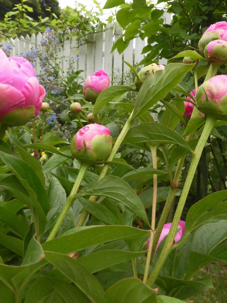 西側からのシャクヤク写真、ボリジとフェンスには葡萄がそろそろ花実月初め