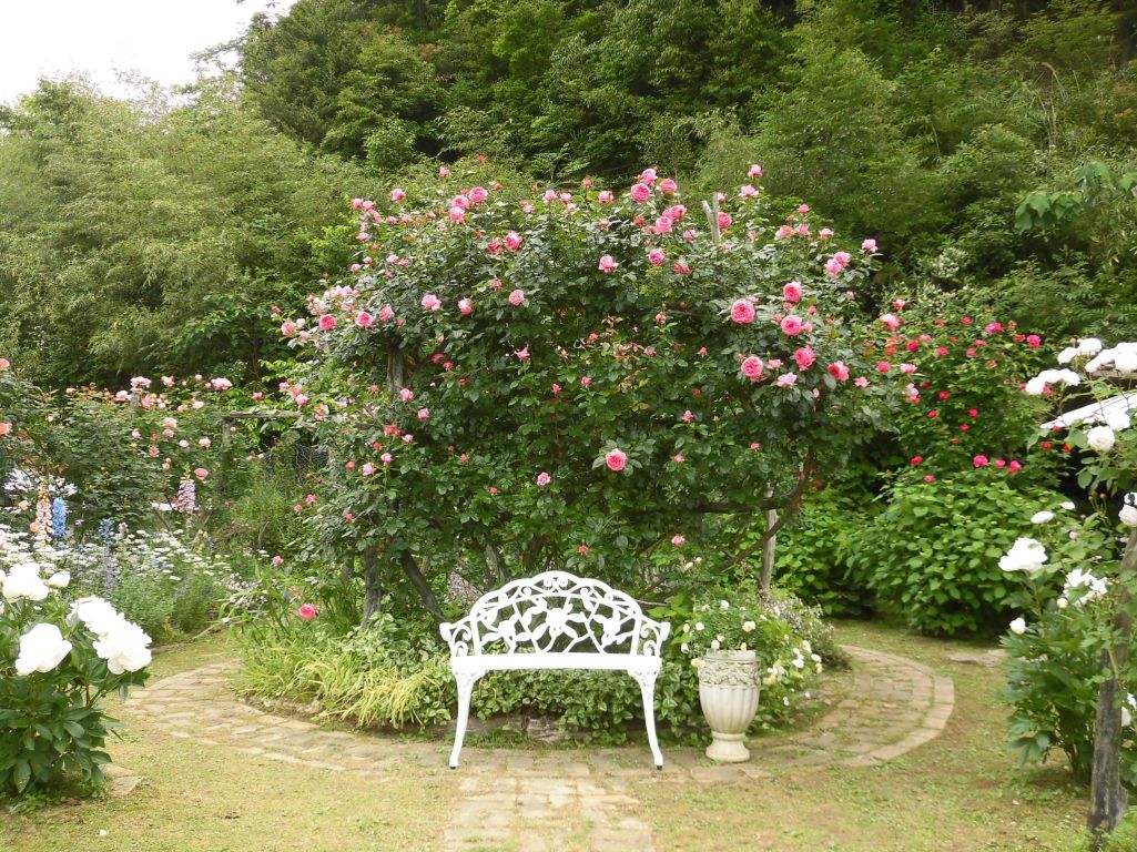 ザ・ローズ ドウ・モリナールと札ついていた薔薇、このアーチも支えは栗の木だそうです。10年のご夫婦手作りの手作りのお庭は里山を輝かせていました。 減反の利用にヒント沢山!