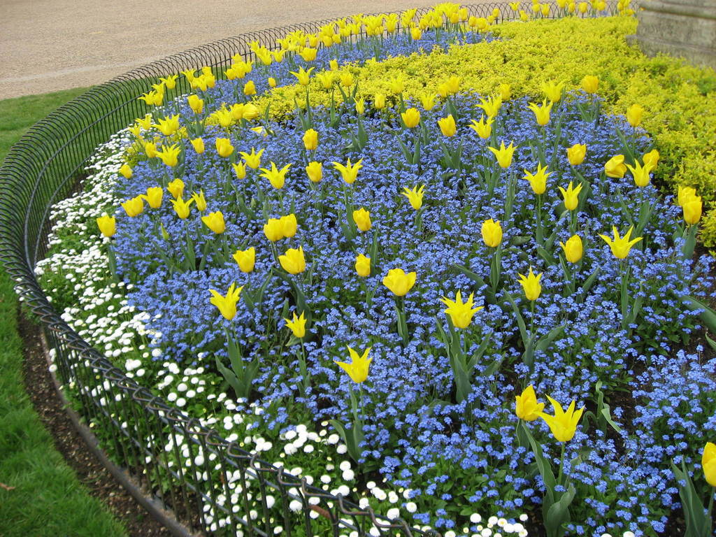 勿忘草とチューリップ、ベストパートナーですね。チューリップは同じ黄色でも形違いがあることで動きが出ていいですね。