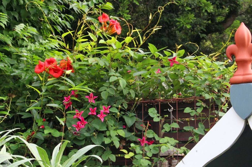アーバーシートの左にはクレマチスのプリンセスダイアナが先月からずっと咲き続けています