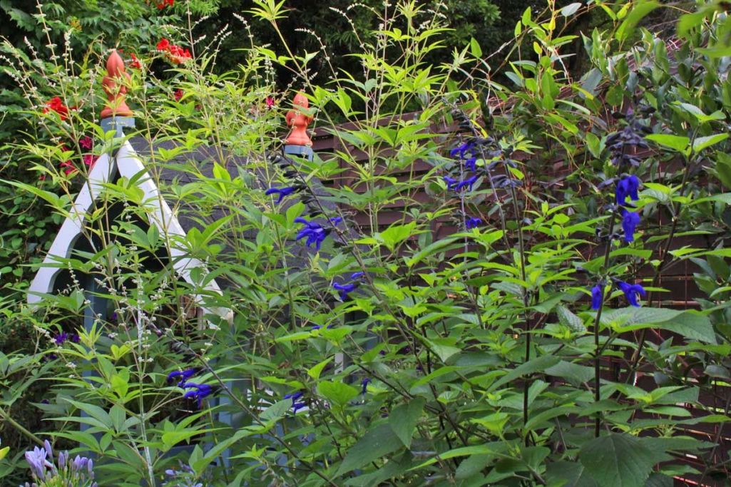 右後ろに咲く青い花はサルビア ガラニチカ