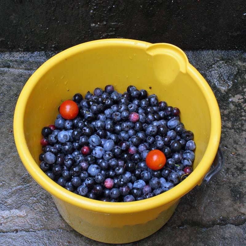 およそ2.5キロの収穫、すっかり濡れて寒くなりました。赤いのはハンギングのミニトマト