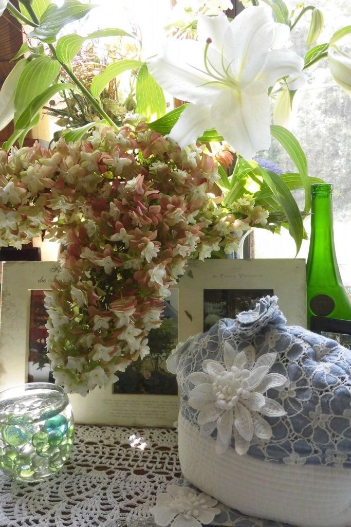 ティーコゼーにもカットレースを添えたして、涼しそうに作り替えました。水害が気になりますが、何もできないことも辛く、毎日変化なく、草刈りなどに追われながら、このくらいは頑張れると自分でパワーアップしているのです。節約もその一つ・・・