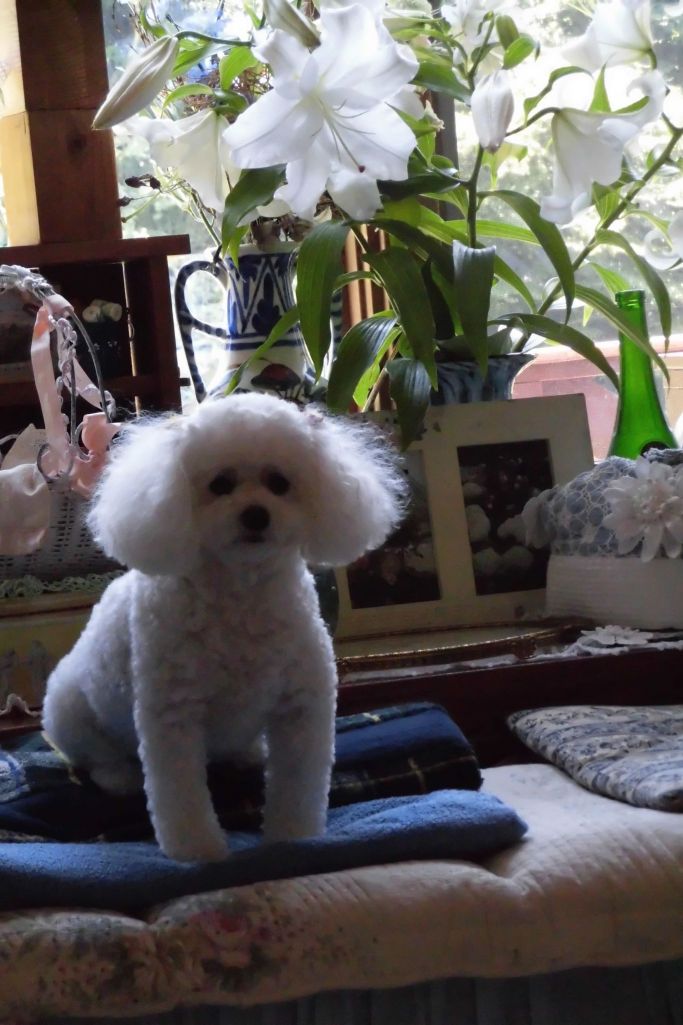 この席にジャンプしてしまいました。カサブランカの香りが好きみたいです。わが家のキャンキャン